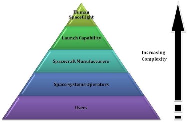 There is a varying degree of technological competence and capability in each segment among different countries involved in space exploitation. This varying technological ability can be used to hierarchically group countries and demonstrate their level of proficiency in space technology as a whole. This expertise hierarchical grouping is shown in the figure below.